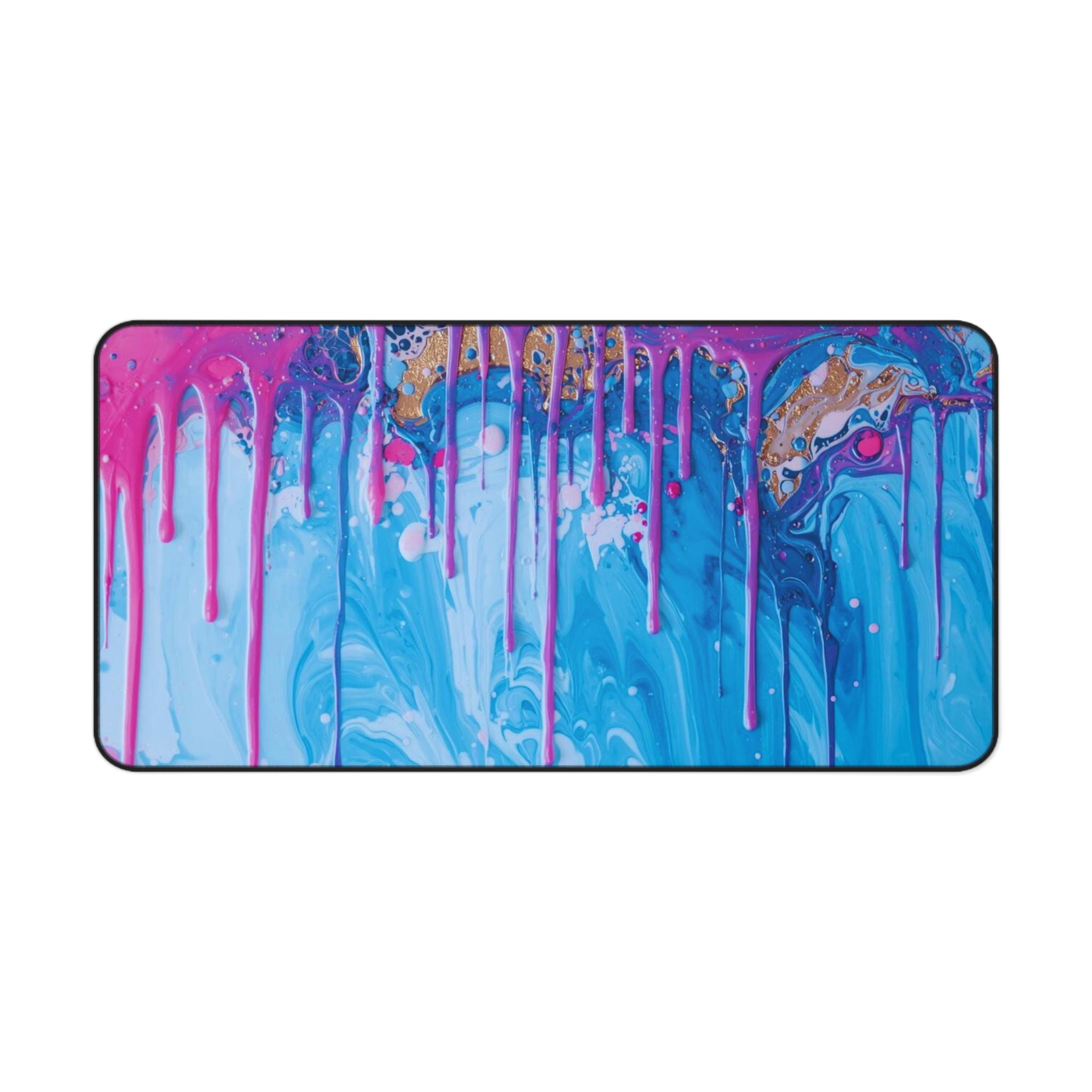 A wide, 16 x 32-inch desk mat where bright, fluid paint pours streak and drip across your workspace like A wide, 16 x 32-inch desk mat where bright, fluid paint pours streak and drip across your workspace like a captured moment of motion. The saturated swirls feel alive under your hands, turning ordinary tasks into something a little wilder and more colorful. It sits steady beneath your keyboard and sketchbook, cushioning wrists and absorbing small spills while the hemmed edges keep the print sharp and the shape true. Set it down when you need a burst of creative energy for late-night projects, weekend crafting, or slow, focused mornings with a mug and a sketchpad.