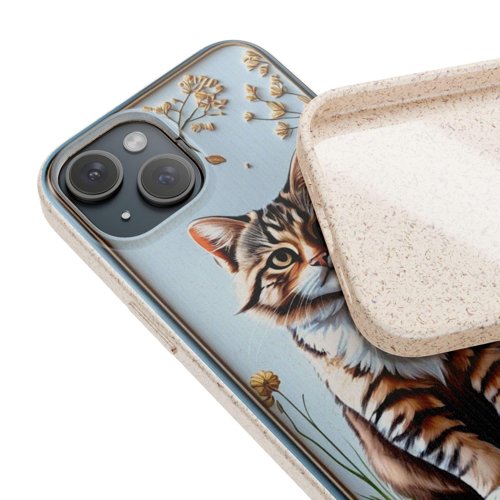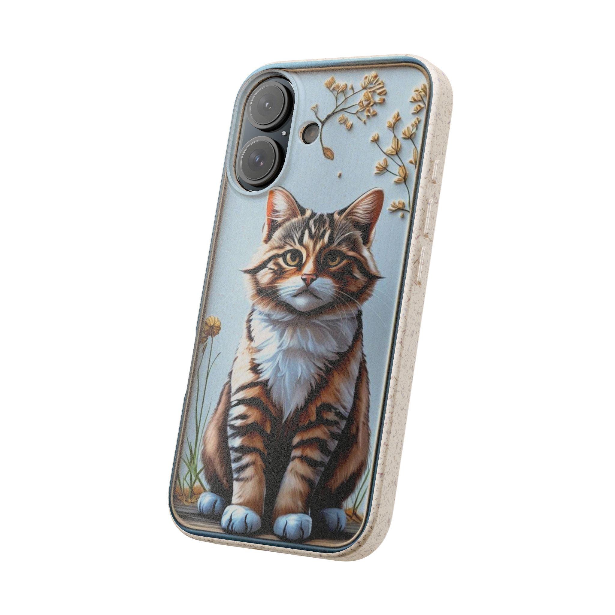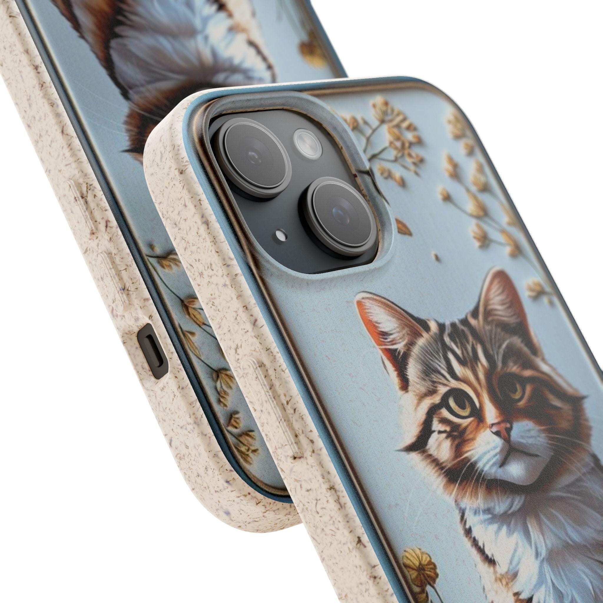 This matte biodegradable phone case brings a warm, hand-painted charm to your everyday carry. A friendly tabby sits framed by dried blooms, rendered in bright, crisp colors that stand out against the soft, frosted finish. The case feels flexible in hand, cushions impact, and slips on easily while keeping ports and buttons accessible with precise cutouts. Made from PLA and PBAT plant-based polymers with bamboo fibre, it breaks down naturally and may carry a subtle natural scent. It supports MagSafe® wireless charging when aligned, and comes with optional gift packaging — a thoughtful choice for anyone who wants to protect their phone and the planet with style.