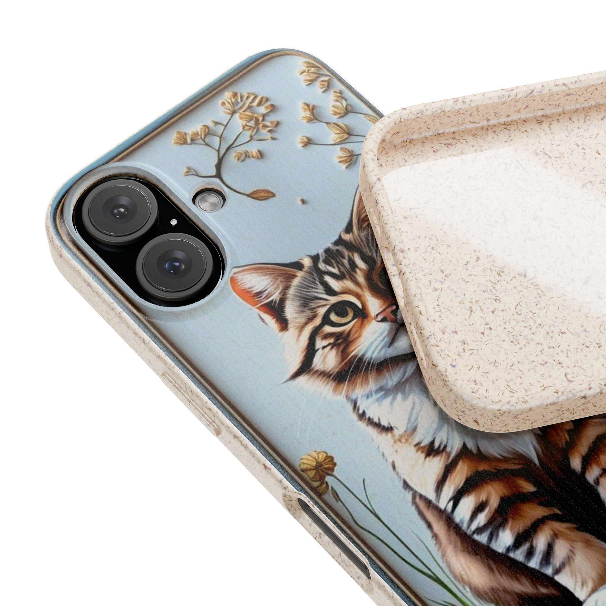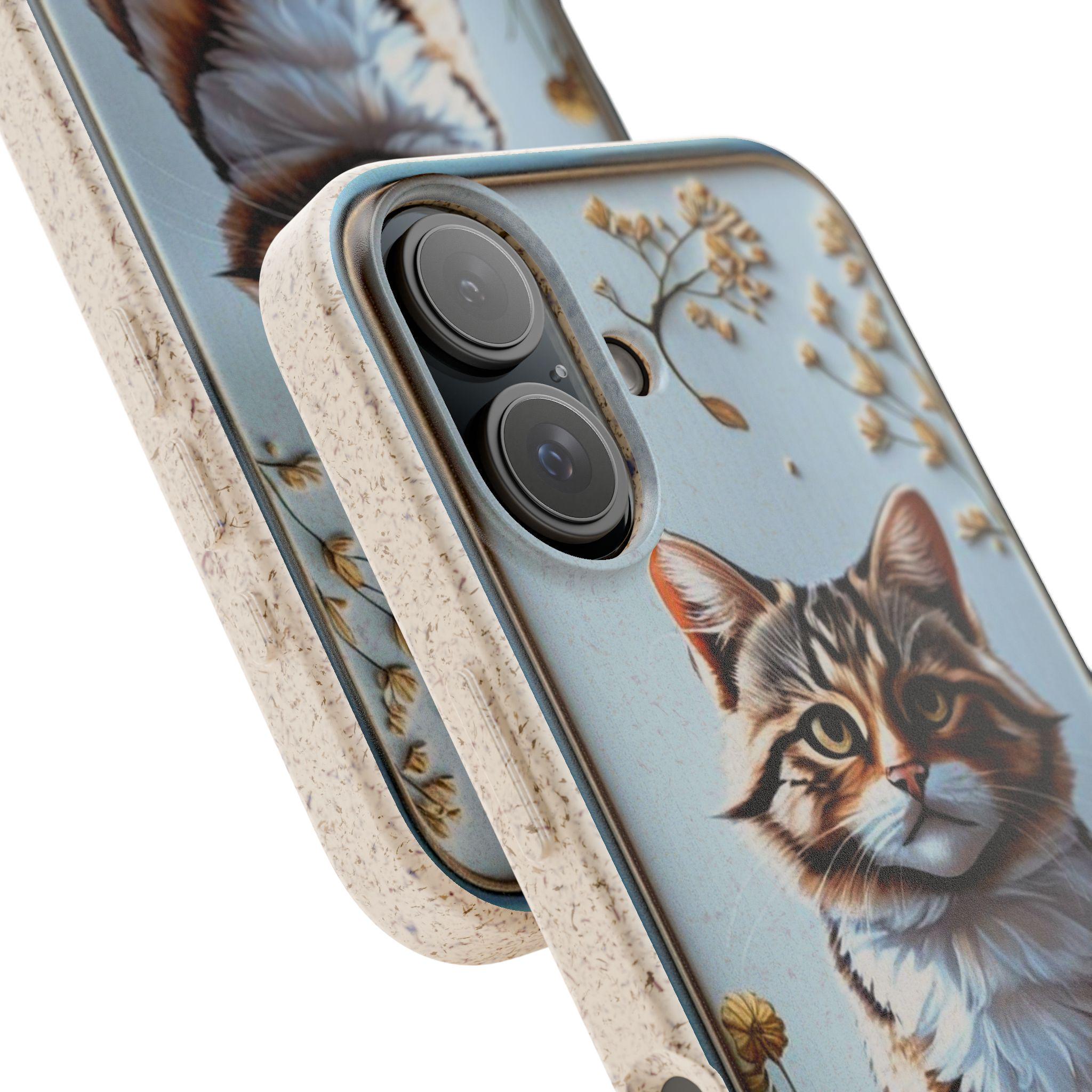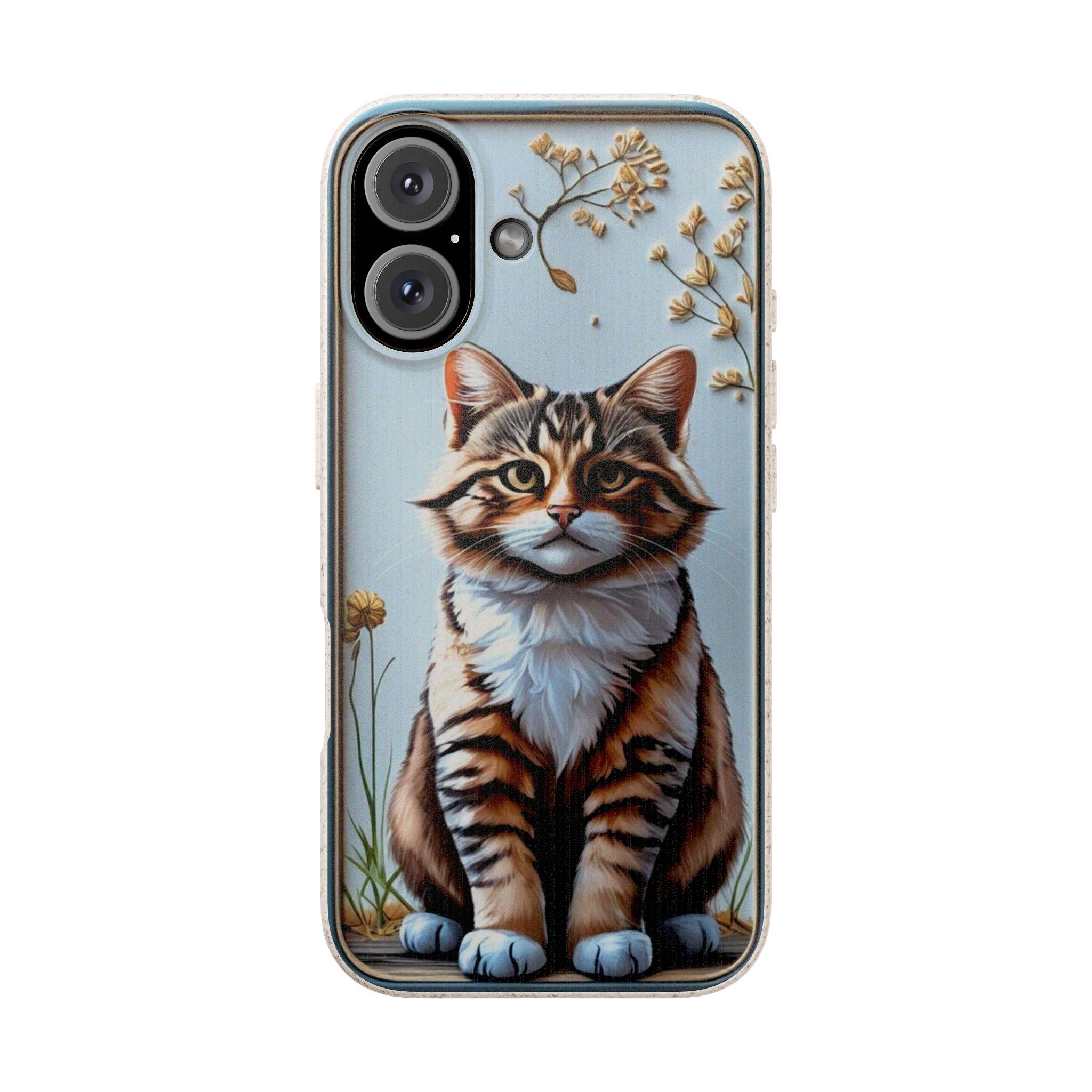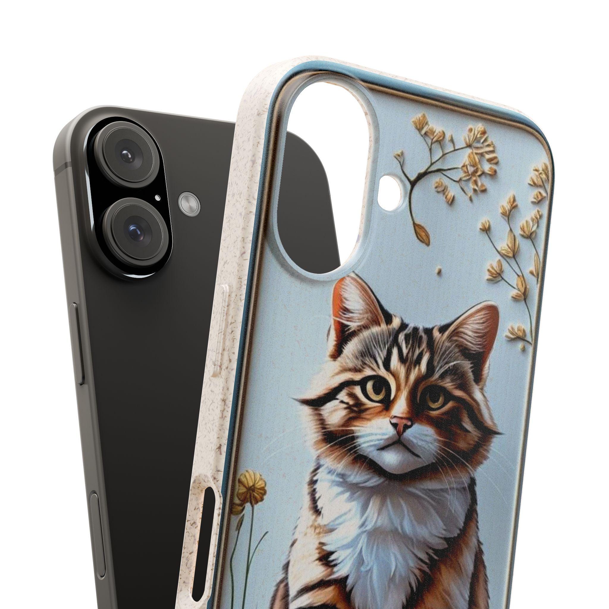 This matte biodegradable phone case brings a warm, hand-painted charm to your everyday carry. A friendly tabby sits framed by dried blooms, rendered in bright, crisp colors that stand out against the soft, frosted finish. The case feels flexible in hand, cushions impact, and slips on easily while keeping ports and buttons accessible with precise cutouts. Made from PLA and PBAT plant-based polymers with bamboo fibre, it breaks down naturally and may carry a subtle natural scent. It supports MagSafe® wireless charging when aligned, and comes with optional gift packaging — a thoughtful choice for anyone who wants to protect their phone and the planet with style.