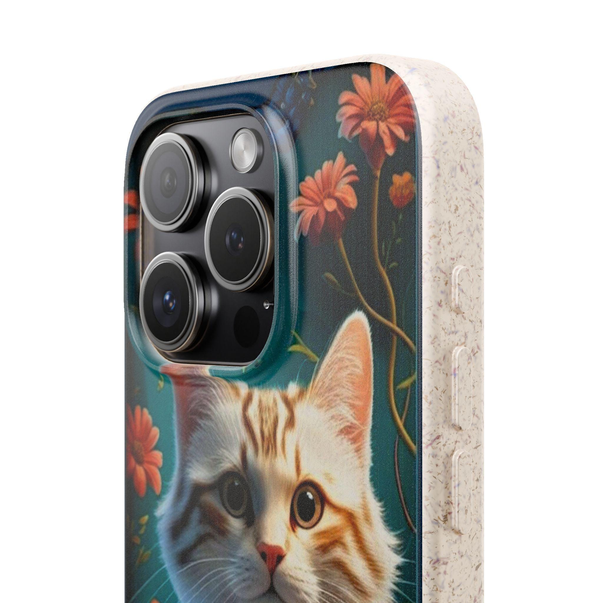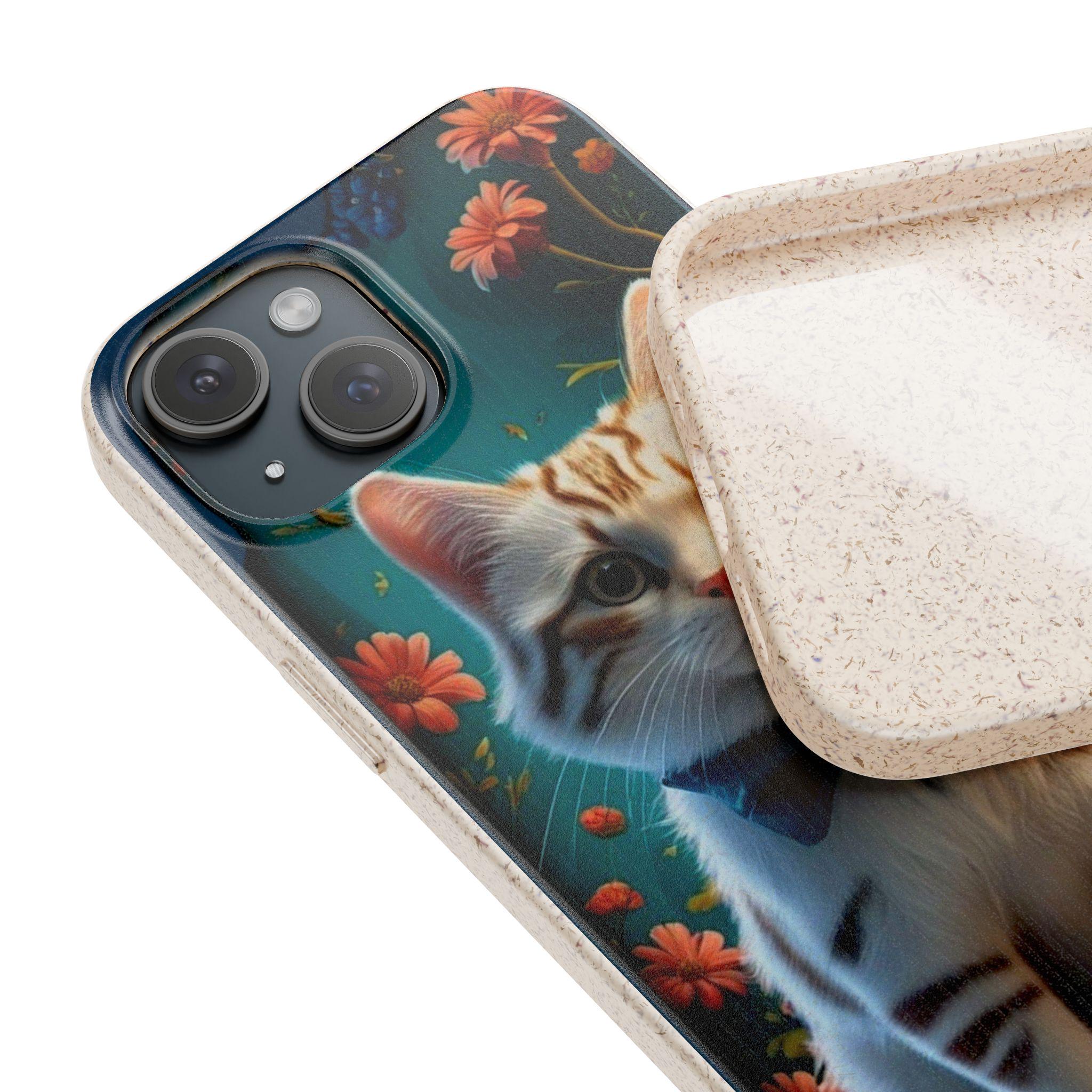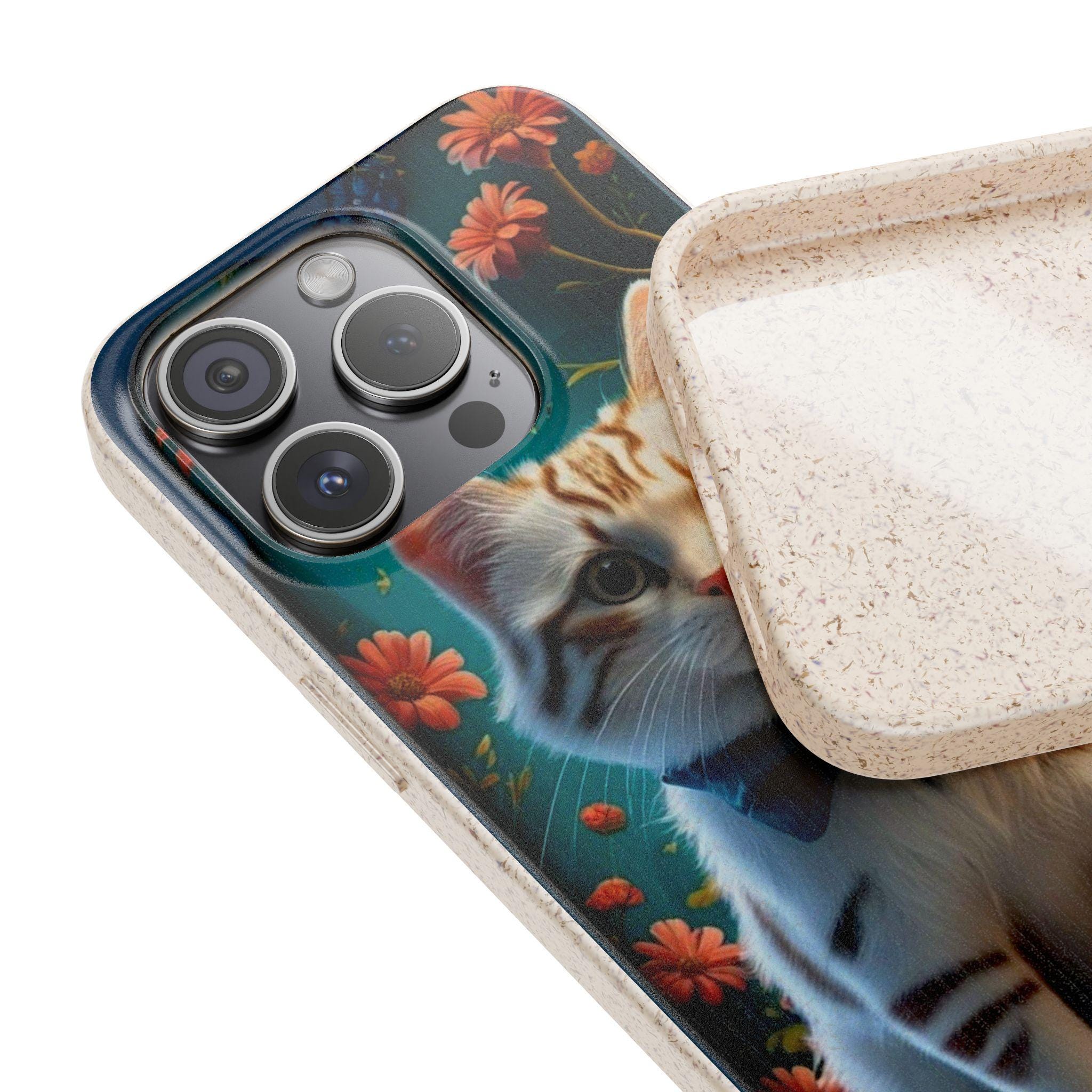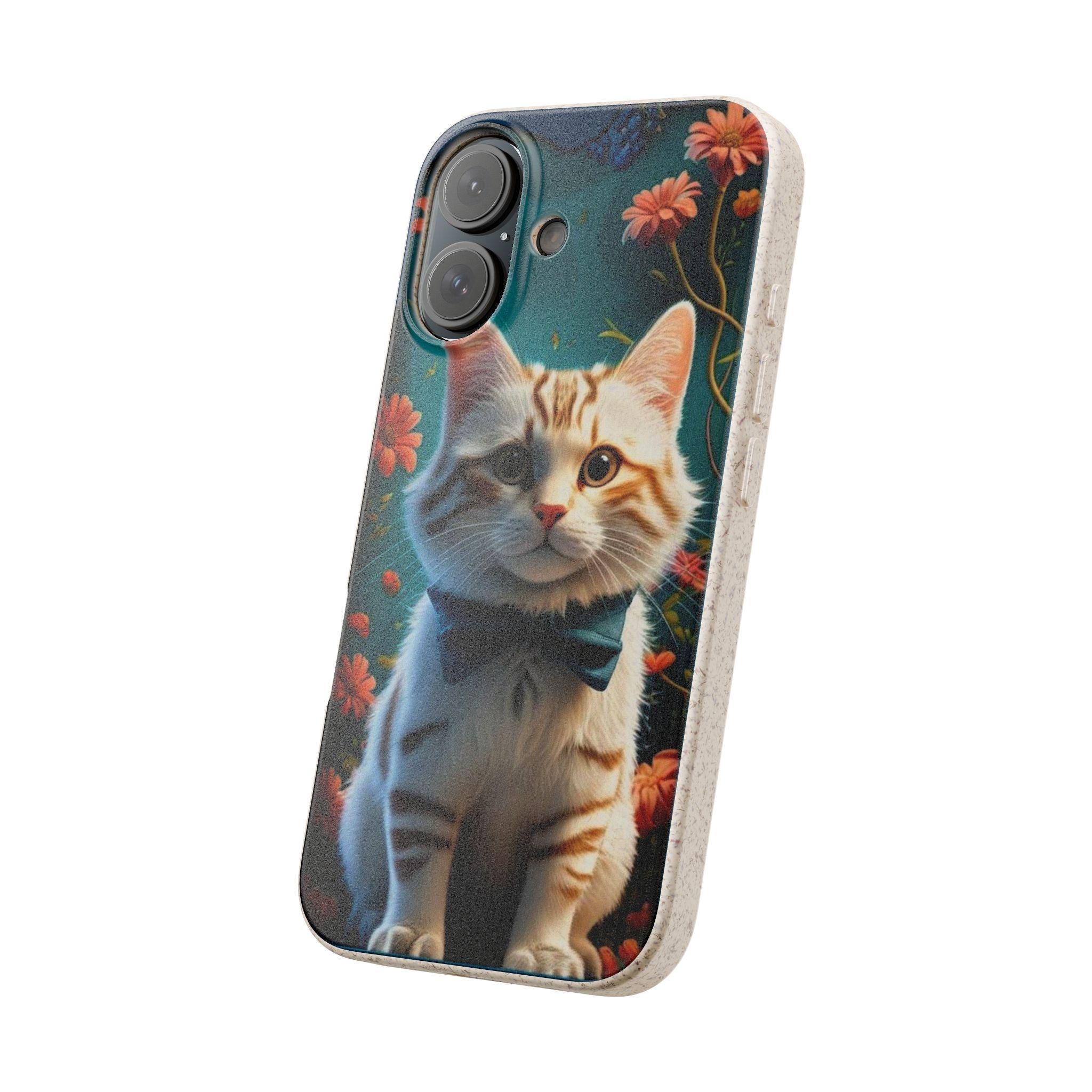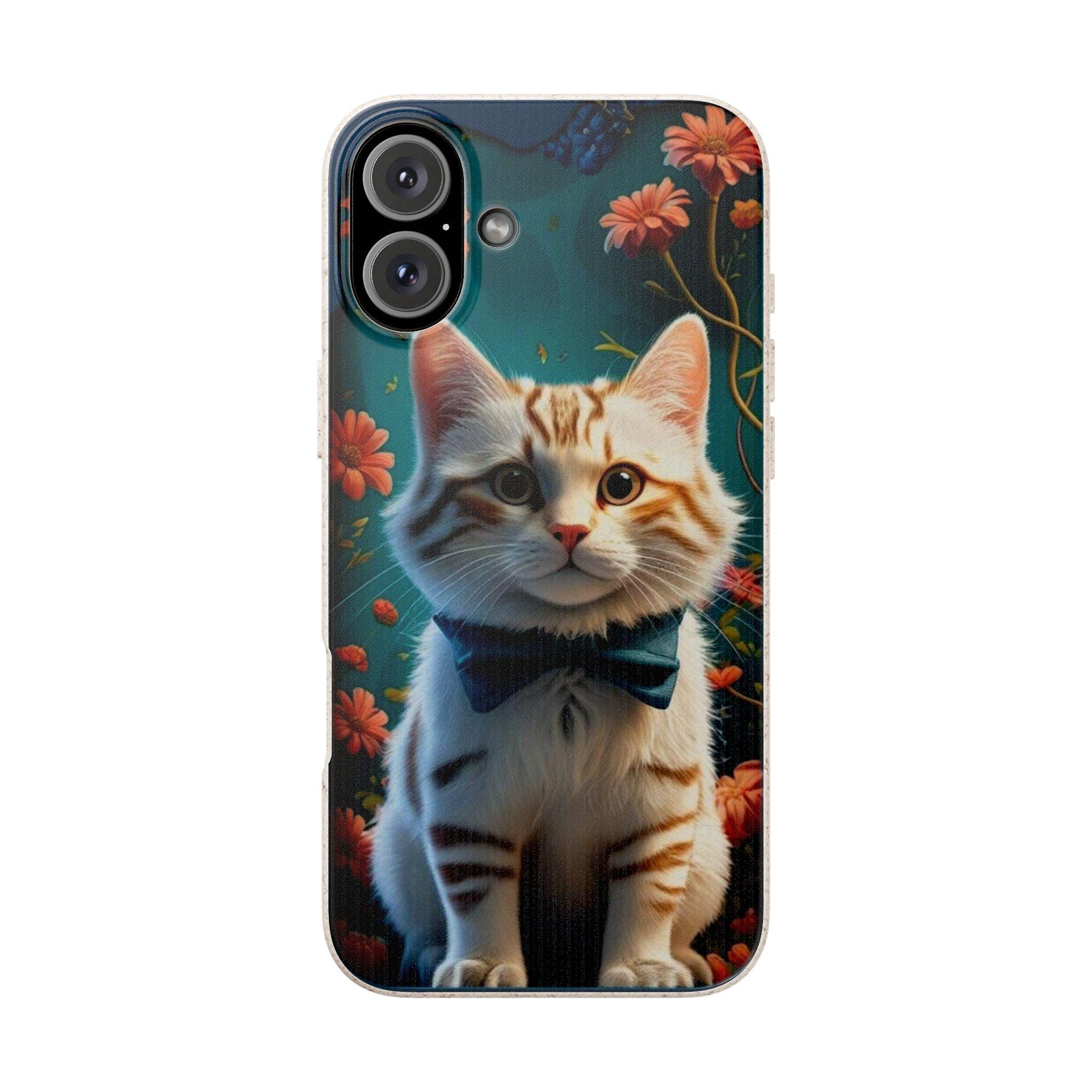 A biodegradable phone case that brings warmth and whimsy to everyday carry. Soft matte finish and vibrant printing showcase a dapper tabby kitten in a bow tie surrounded by glowing wildflowers. The slim, flexible shell cushions against bumps while precise cutouts keep ports and buttons accessible. Made from plant-based PLA and bamboo fiber, it breaks down naturally and avoids conventional plastics — so your phone looks charming and your footprint feels lighter. Subtle natural scent may be present. Gift-ready packaging available.