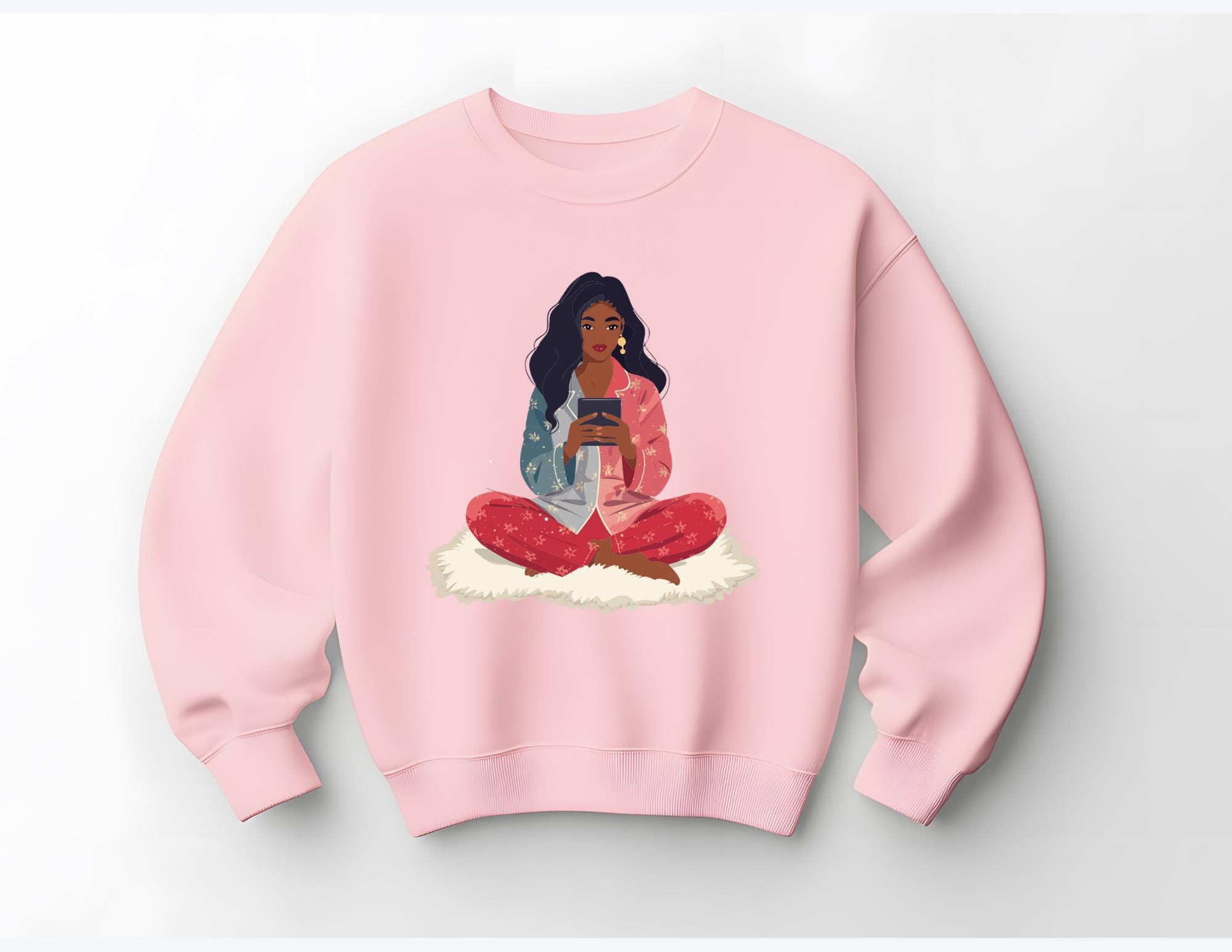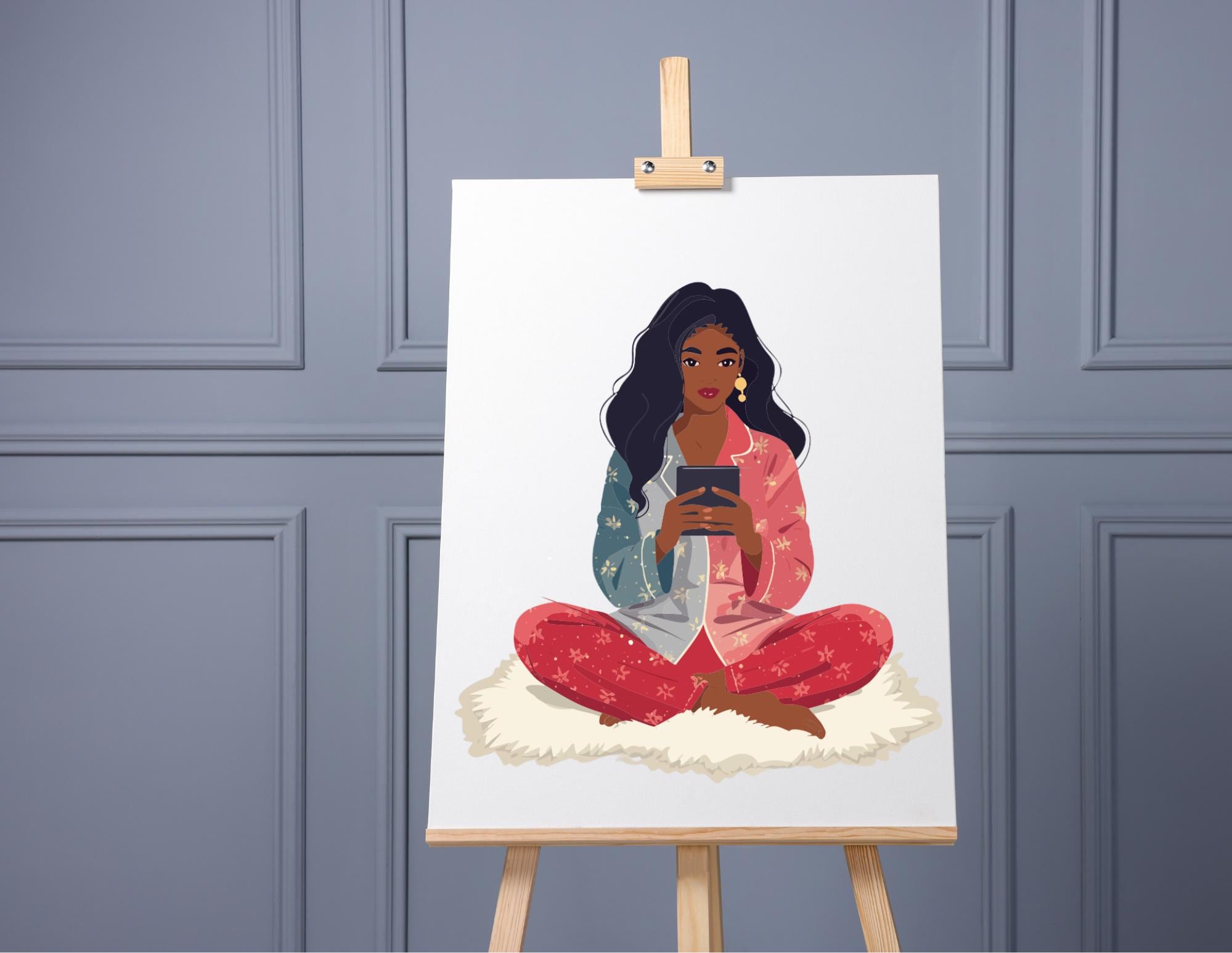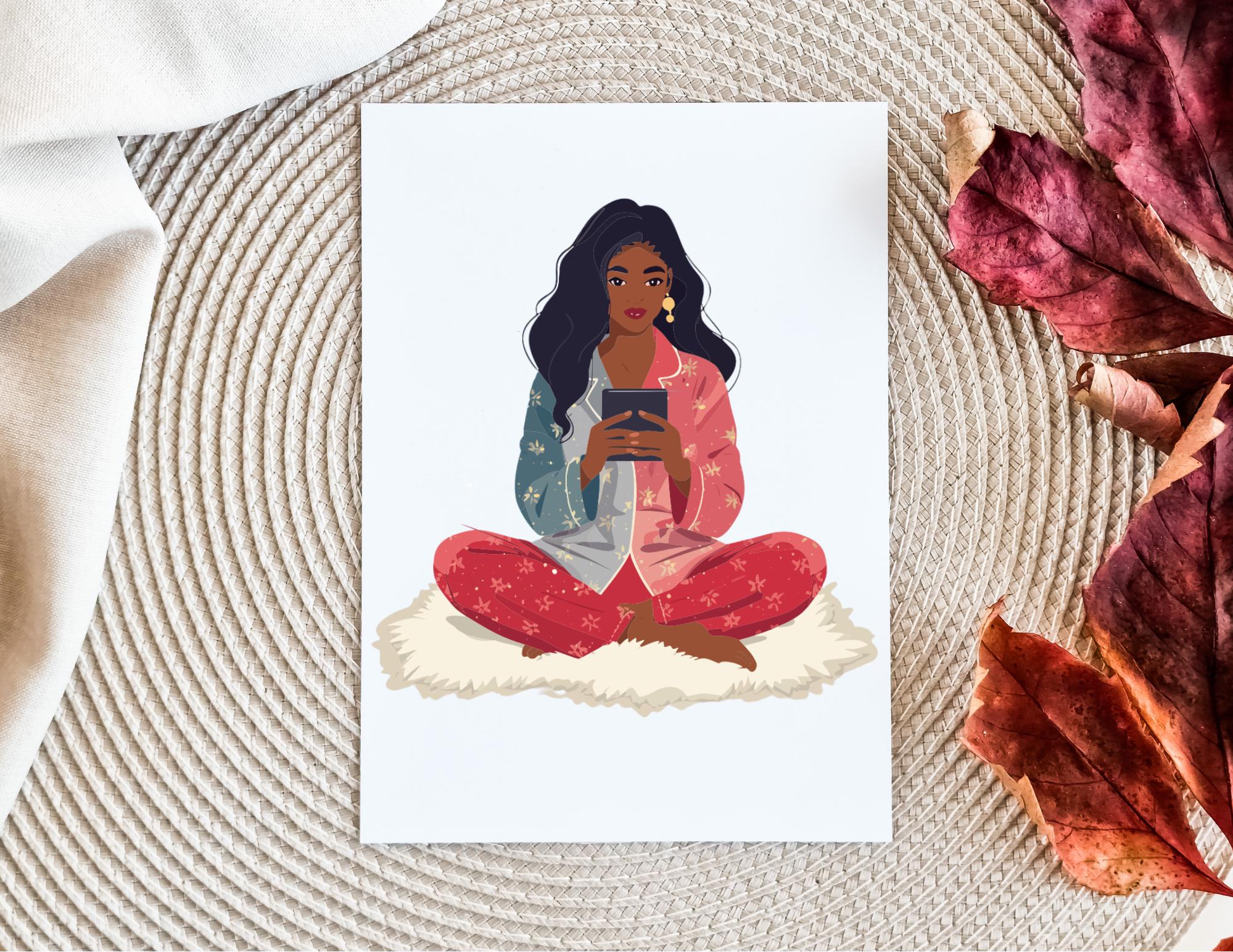 Relaxed, cozy, and effortlessly beautiful — this Brown Goddess with Tablet SVG captures a serene moment of self‑care. Featuring a stylish Black woman in soft pajamas, sitting comfortably on a white furry rug with her tablet in hand, this design is perfect for creators who love warm, modern, feminine aesthetics.